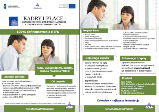 Szkolenie „Kadry i płace” składa się z dwu modułów „KADRY” i „PŁACE (WYNAGRODZENIA)” obejmujących łącznie 112 h dydaktycznych. Projekt będzie realizowany w okresie od 01.11.2013 do 30.06.2015. W tym czasie planujemy przeszkolić 90 pracowników (76 kobiet, 14 mężczyzn) z łącznie 80 mikro, małych i średnich przedsiębiorstw z terenu województwa lubuskiego.