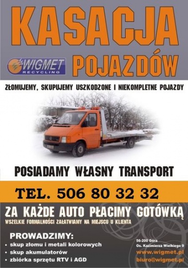 ZŁOMOWANIE AUT, KASACJA, Przyjeżdzamy za darmo, PŁACIMY