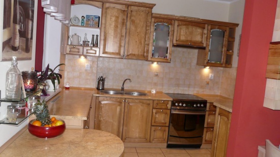 Zabudowa kuchenna drewniana „brzoza” w zabudowie kuchenka elektryczna Amica, okap Amica, meble wykonane pod wymiar z stołem w odcieniu blatu kuchennego.