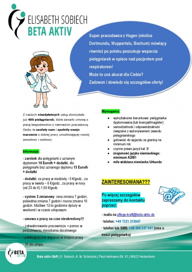 ZAINTERESOWANA??? Po więcej szczegółów zapraszamy do kontaktu poprzez: - maila na pflege-(skorzystaj z formularza) - telefon: +49 7321 315047 - telefon lub SMS: +48 504 237 041 (sms o treści pielęgniarka)
