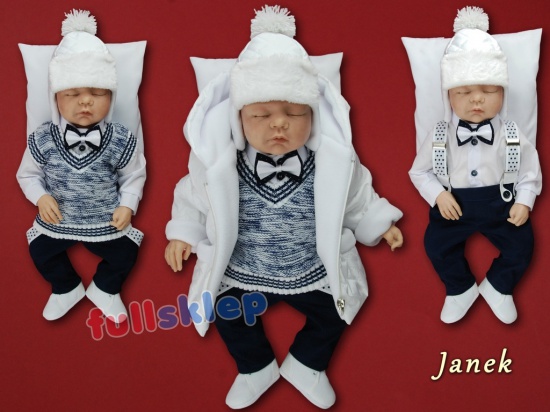 6) - Zestaw zawiera w kolorze białym w ciemno niebieskie groszki szelki tradycyjne zapięcia na guziki.