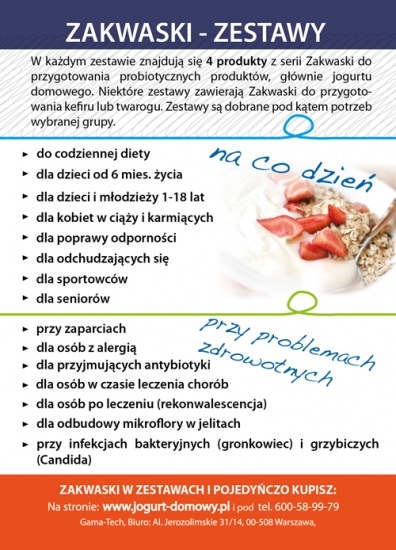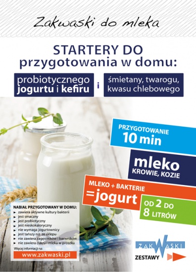 Zakwaski do mleka - do samodzielnego przygotowania jogurtów, kefiru, twarogu i kwasów z owoców i warzyw. Zestawy zakwasek: dla dzieci, kobiet w ciązy i karmiących, sportowców, seniorów, przy odchudzaniu, dla poprawy odporności, dla leczonych antybiotykami, dla rekonwalescentów, dla seniorów, przy zaparciach, przy alergii, przy infekcjach gronkowcem i Candidą.