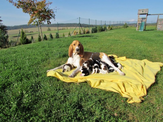 Kennel offers gorgeous and completely healthy puppies of Swiss hound breed after exterior and perfect character parents. Mother is CZ champion, father is CZ juniorchampion. Puppies will have not a pedigree due to the connection of different colors. Deworming, vaccinations, contract of sale and breeding services of course. Swiss Hound is intelligent, very affectionate and friendly dog who loves his family, also suitable for small children. Like a pack of dog will be happy for four-legged friend. Price is 250,- Euro, transport to Germany (Austria, Poland ...) we will provide.