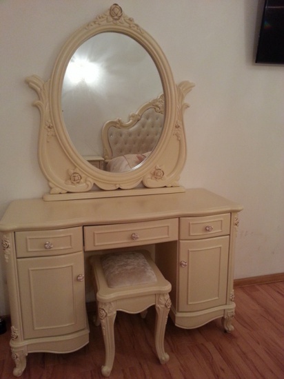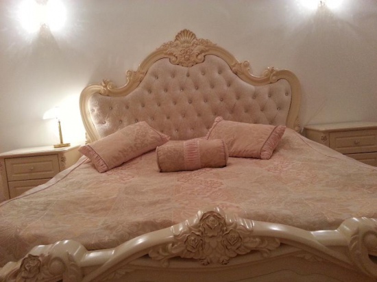 Sprzedam przepiękną, wręcz niepowtarzalną, bajkową sypialnię z toaletką, taboretem, czterodrzwiową szafą oraz dwoma szafkami nocnymi wykonane na styl pałacowy ze złotymi zdobieniami i kryształkami przy łożu.
